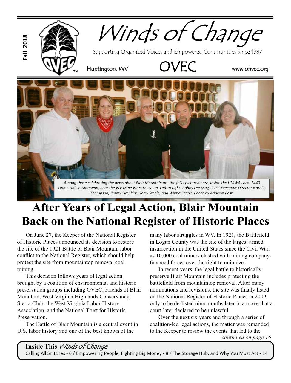 Renewable Energy, Energy Efficiency and Economic Transition: OVEC promotes increased energy efficiency through legislation, and by working with homeowners, faith communities, businesses and others. We also promote locally owned renewable energy,essential for the transition to a sustainable economy in Central Appalachia.