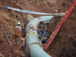 Above: Notice the smaller, darker blue pipe crossing at the top of the photo, above the fellows who are welding together two sections of the 36-inch diameter pipeline (in other areas, the Rover Pipeline is 42-inch). Lashed with pipe-wrap insulation tape to that blue pipeline is a white water line. Also attached to the blue pipe are a heat tape and an an extension cord (plugged into a stinky diesel generator). Since we could see no sign of the water line having been severed by excavation equipment (although that could be the case), Bill speculates that the blue pipe was strung across the work area to help support the water line, and the assorted heating elements—added after the family notified the construction crew that they had no water. Speculation: the intact water line may have frozen the night after it was exposed.