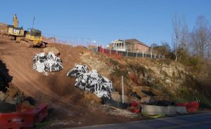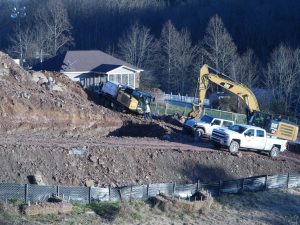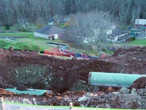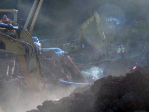 The first day we visited, Bill spoke with one of the homeowners, who told Bill his family had no water. Even though a survey crew had clearly marked domestic water and gas lines before the excavation began, something happened and the family’s water supply was cut off. (A few weeks prior, their gas line had been cut.) Once we zoomed in on some of the photos we took during our visits, Bill speculated on what may have happened to the water line…
